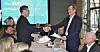NHO Reiselivs forhandlingsleder Magne Kristensen (t.h.) og Fellesforbundets Clas Delp utveksler krav i forbindelse med tariffoppgjøret 2024.
