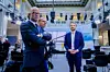 NHO leder Ole Erik Almlid, Stian Sigurdsen, direktør i samfunnspåvirkning i Virke, og næringsminister Jan Christian Vestre etter pressekonfeansen om strømtiltak for næringslivet i Marmorhallen.
