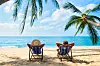 Couple relax on the beach enjoy beautiful sea on the tropical island. Summer beach vacation concept